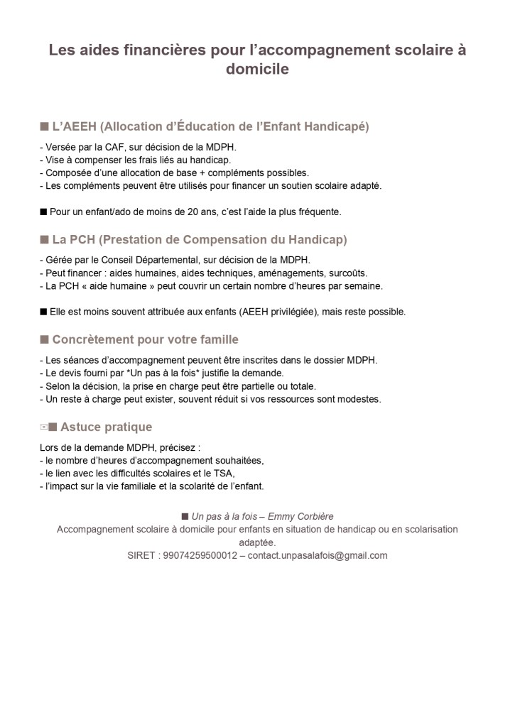 Vous faites appel à mes services pour accompagner votre enfant reconnu en situation de handicap par la MDPH. Voici les aides financières que vous pouvez mobiliser pour alléger le coût de cet accompagnement pédagogique individualisé à domicile.